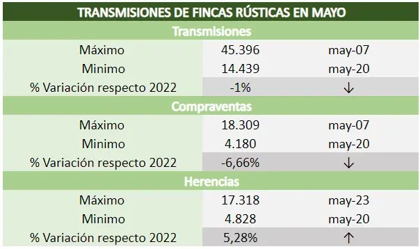 En mayo, se transmitieron un total de 42.084 fincas rústicas, de las que 17.318 corresponden a herencia, 14.433 a compraventa, 8.478 a otro tipo de transmisión, 1.528 a donación y 327 a permuta.