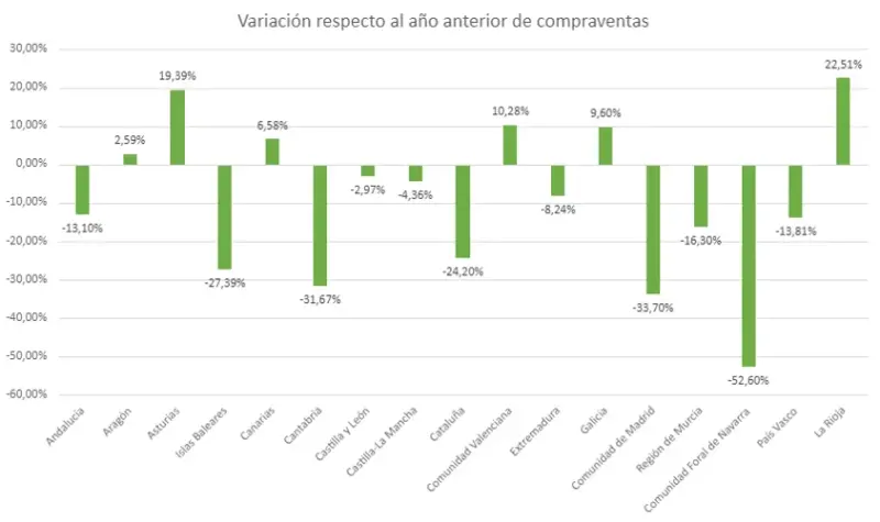 En el séptimo mes del año, sólo se compraron más fincas rústicas que en el mismo periodo de 2022 en seis regiones: Asturias (28,0%), La Rioja (22,5%), Comunidad Valenciana (10,3%), Galicia (9,6%), Canarias (6,6%) y Aragón (2,6%).