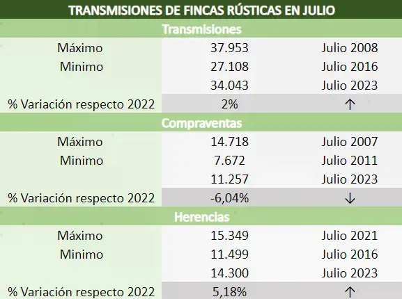 En total, se transmitieron 34.034 fincas rústicas, un 12,6% menos que en junio y una subida del 1,9% en relación con el mismo periodo del año anterior. De estas, 14.300 fueron herencias, 11.257 compraventas, 7.028 otros tipos de transmisión, 1.186 donaciones y 272 permutas.