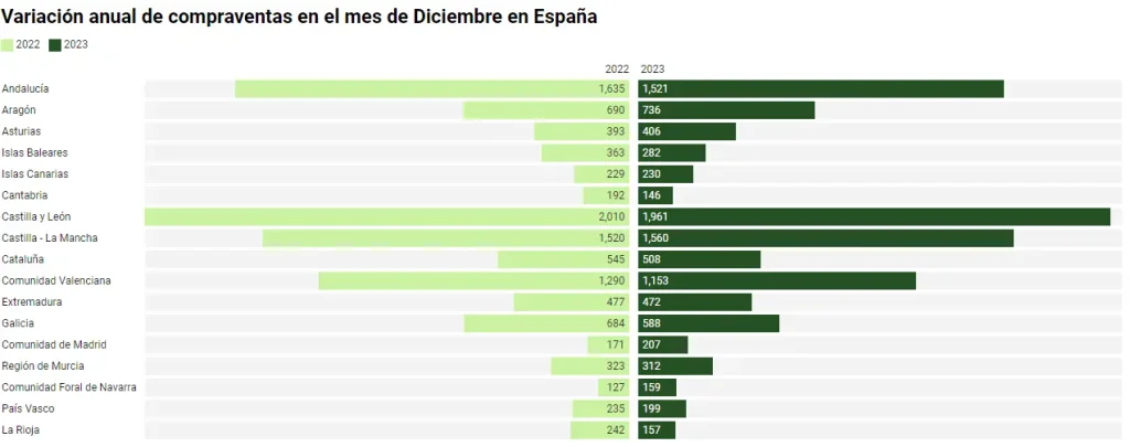 A nivel regional, Castilla y León (23.153 propiedades), Andalucía (22.111), Comunidad Valenciana (19.436) y Castilla-La Mancha (19.047) experimentaron el mayor número de compraventas de fincas rústicas en 2023.