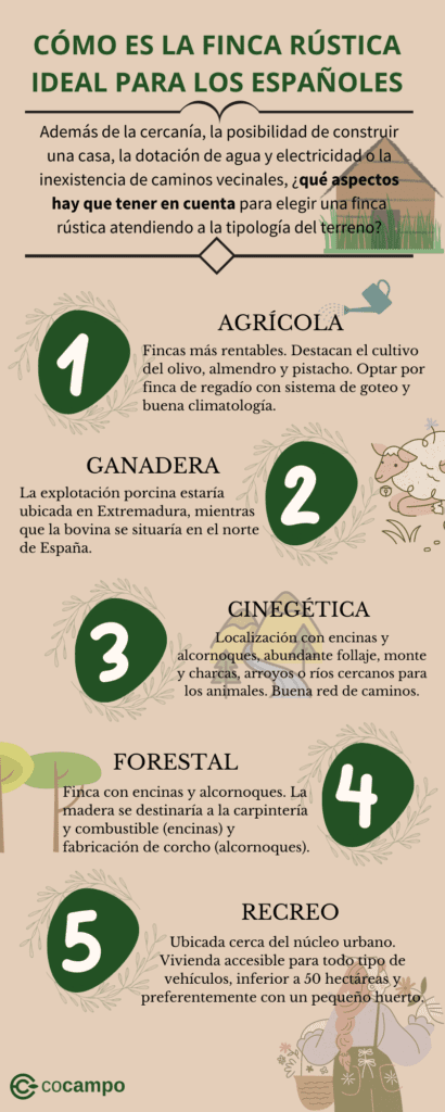 Todo esto hará la finca rústica ideal, aunque según la tipología (agrícola, ganadera, cinegética, forestal o de recreo), variarán los aspectos a tener en cuenta para que sea realmente el terreno ‘perfecto’. Nuestros expertos de Cocampo nos lo explican.